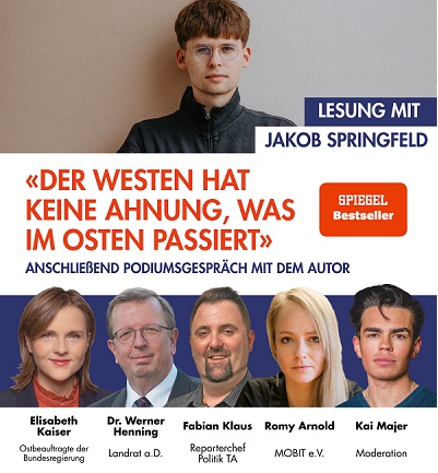 Mit dabei sind Elisabeth Kaiser (Ostbeauftragte der Bundesregierung), Dr. Werner Henning (Landrat a.D.), Fabian Klaus (Thüringer Allgemeine), Romy Arnold (MOBIT e.V.) und Kai Majer (Moderation).